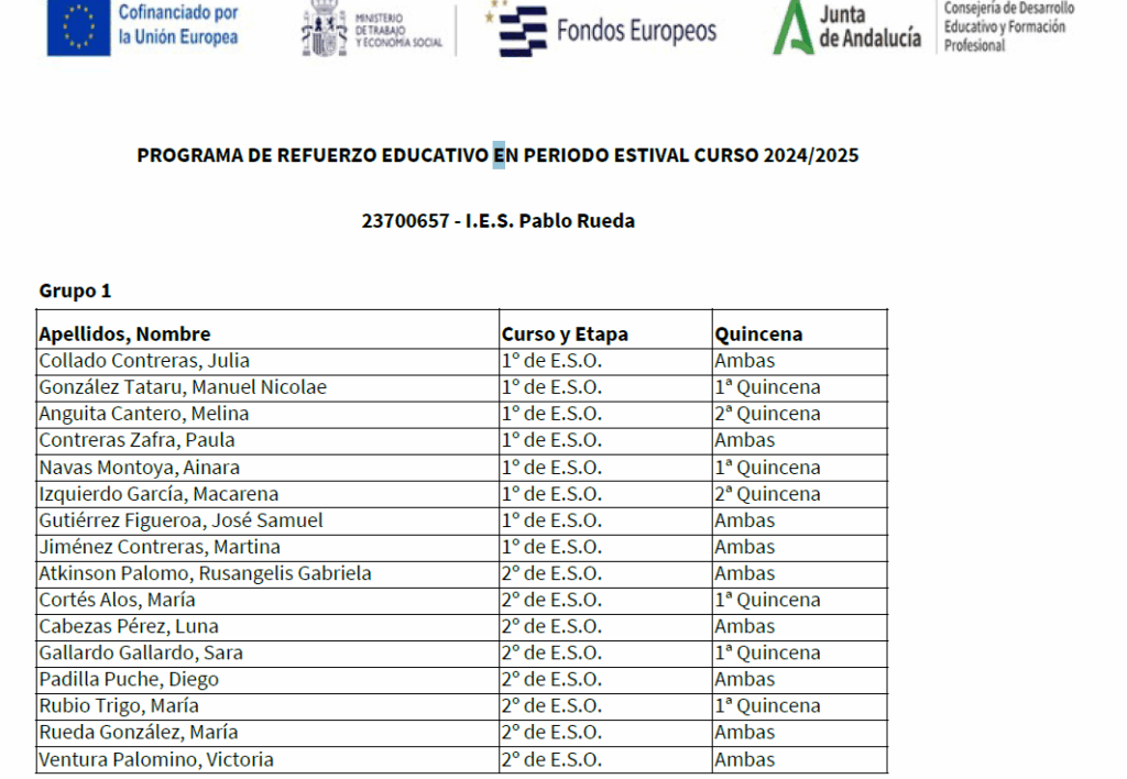 Relación provisional de alumnado participante en el Programa de Refuerzo Educativo en periodo estival 2024-2025